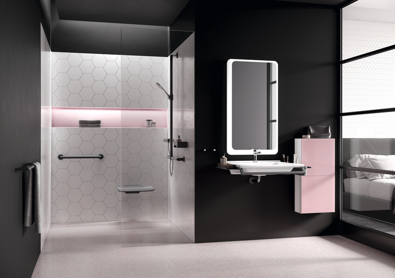 Im Waschtisch-Bereich der pflegegerechten Badkojen wurden der modulare Waschtisch mit Duschhocker sowie der Becher, der Seifenspender, der Abfalleimer, der Handtuchring und die Fönhalterung von System 900 sowie Ablagen des System 815 installiert.