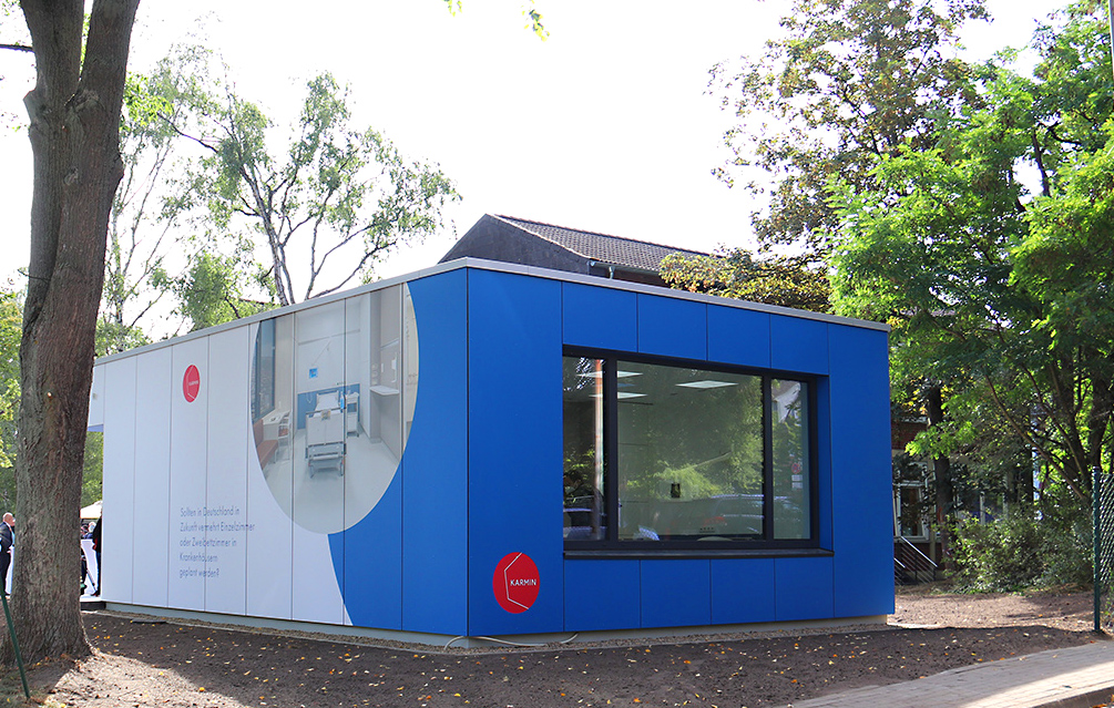 Der Prototyp des Patientenzimmers wurde im Projekt KARMIN entwickelt und auf dem Gelände der Charité im Rahmen des World Health Summit 2020 in Berlin ausgestellt. Jetzt wird der Demonstrator in ein neues anwendungsorientiertes Forschungs- und Studienlabor überführt. Die KooperationspartnerInnen – das Institut für Konstruktives Entwerfen, Industrie- und Gesundheitsbau (IKE) der TU Braunschweig, das Fraunhofer IST und das Städtische Klinikum Braunschweig – können damit Forschungsergebnisse in realer Umgebung direkt einbinden und unmittelbar erproben.