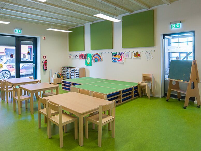 Die gesamte Anlage verfügt über viele Oberlichter, die die Kindertagesstätte mit ausreichend Tageslicht versorgen. Bei gutem Wetter können sie geöffnet werden und an dunklen Tagen halten sie den Bereich trotzdem hell genug. Die Fenster helfen Strom zu sparen, doch auch ansonsten ist die Kita ein Energiesparhaus. Sie verfügt über eine Fotovoltaikanlage auf dem Dach, die das gesamte Gebäude mit Strom, Wärme und Warmwasser versorgt. Anfallende überschüssige Energie wird verkauft und dadurch werden zusätzliche Einnahmen generiert und die laufenden Kosten minimiert.