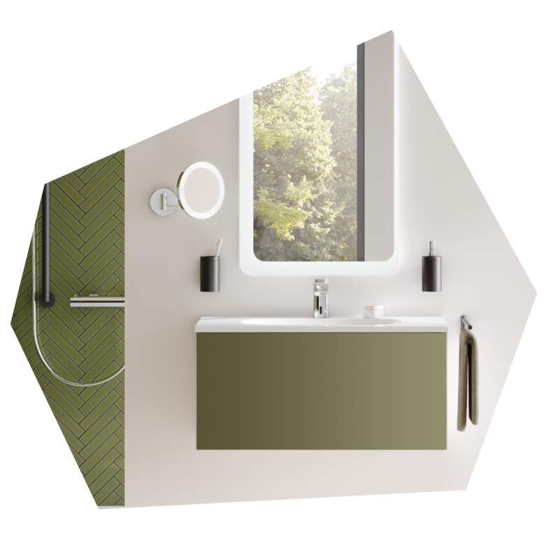 Our modular washbasin offers convenient support in everyday life and completes your barrier-free home. It has adaptive additional functions, such as a towel rail and storage surfaces. Products such as soap, toothbrushes and the like are always within easy reach.