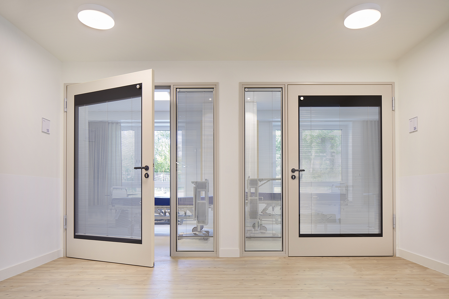 On room doors, the classic HEWI lever handle System 111 – in a matt black finish – is like a statement in itself. The design language of the lever handle, reduced to the essentials, blends seamlessly into the timelessly modern architecture of the hospital and at the same time forms a maximum colour contrast to the white doors – sometimes in combination with a round WC-type or key escutcheon and in optional areas with an electronic lock cylinder.