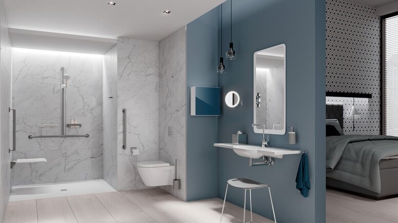 Le système 900 est la réponse aux exigences complexes des salles de bains sans barrières. Les produits sont bien pensés jusque dans les moindres détails : ils convainquent par leur fonctionnalité, leur qualité durable, leur technologie d'assemblage intelligente et leur conception hygiénique. Le système 900 répond aux exigences d'une grande variété de types de bâtiments, que ce soit dans la salle de bains ordinaire d'un hôpital, dans le service confort d'une clinique privée, dans une maison de soins ou dans une maison de retraite exclusive.