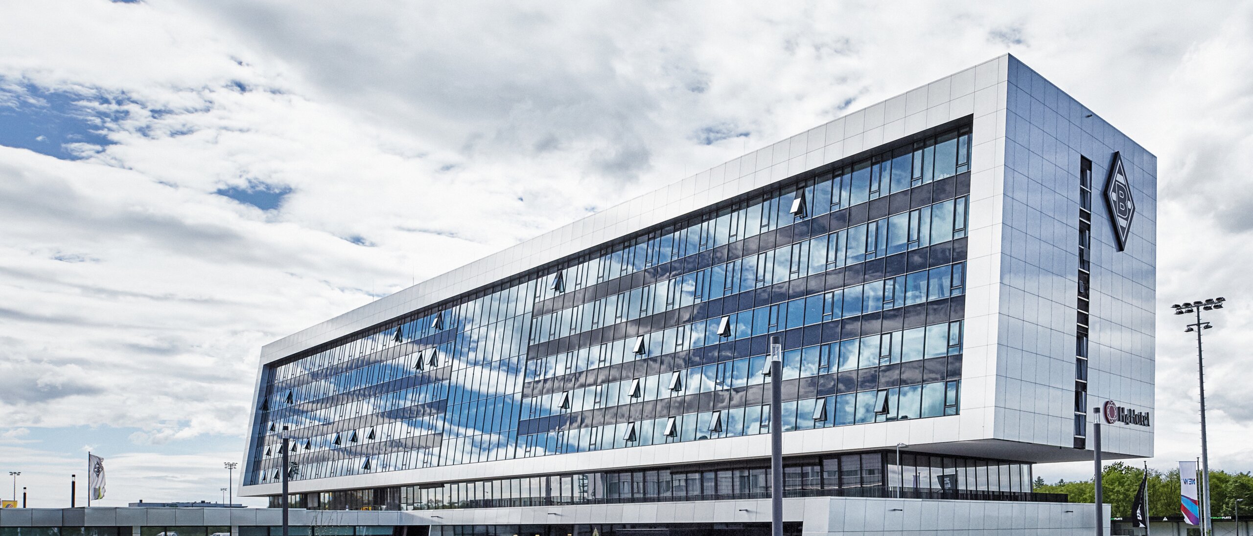 De nabijheid van het voetbalveld van Borussia Mönchengladbach beïnvloedt het ontwerp van de kamers van het H4 Hotel en het gebouw.
