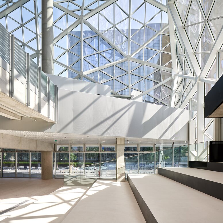 De "werkbol" lijkt bijna reusachtig, met zijn enorme kamerhoogte die doet denken aan middeleeuwse kathedralen. De werkruimten zijn verdeeld in de stijl van een open terrassenlandschap, elk een gelegenheid om elkaar te ontmoeten, ideeën uit te wisselen en samen te pauzeren.