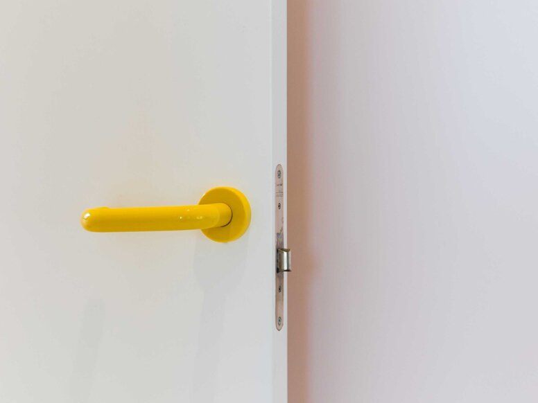 Met de kleurrijke deurklink 111 nodigt de ontwerpster van het showhuis, Christine Leja, de gasten letterlijk uit om binnen te komen en de kamers in zich op te nemen. De kruk geeft een stijlvol accent aan de deur en laadt de sfeer in de kamer positief en vrolijk op. Qua kleur wordt dit op verschillende plaatsen in de rest van het interieur van het huis weer opgepakt waardoor er spannende kleurcontrasten met andere meubelstukken ontstaan.